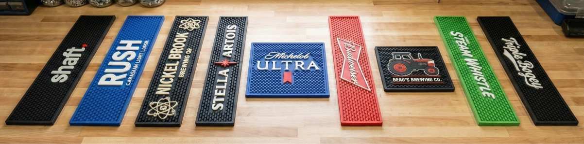 Custom bar mats come in standard rail sizes, large bar runners, and fully custom dimensions.